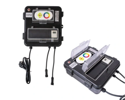В комплект входит электрическая коробка, в которой размещается вся электроника, управляющая фонтаном и освещением. Для правильной работы и долговечности коробка должна находиться в сухом и затененном месте. На него не должны попадать прямые солнечные лучи, так как электронные компоненты могут перегреться.