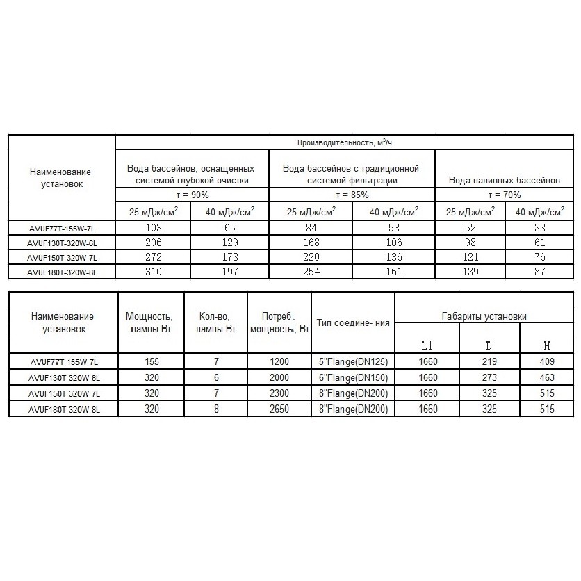 - Скорость потока: 106 м³/ч при 40 мДж/см2